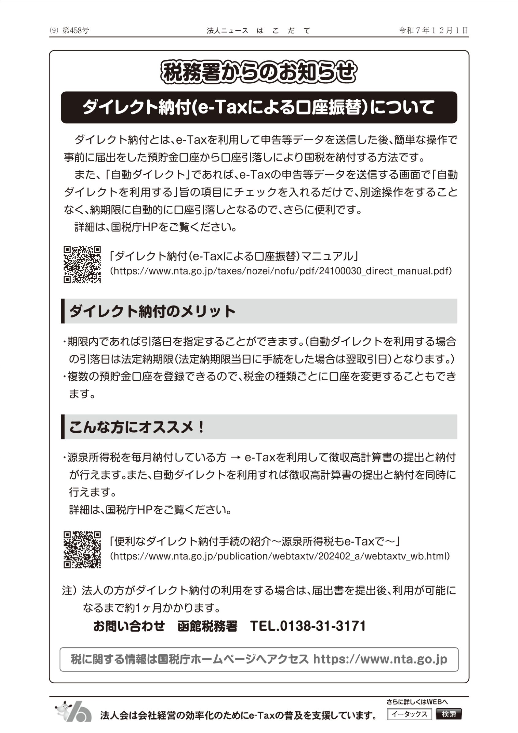 ●【国税庁】源泉所得税のダイレクト納付(e-Taxによる口座振替)をご利用下さい